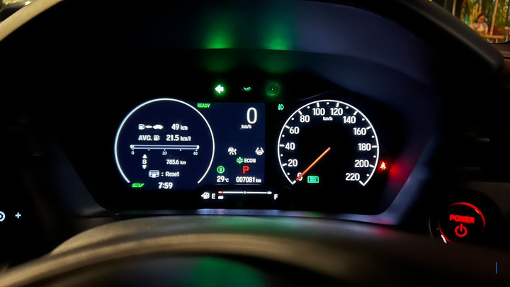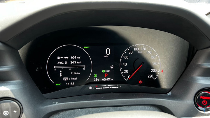 Pada pagi menjelang siang, Honda HR-V Hybrid langsung menunjukkan karakter khasnya. Sistem hibrida yang menggabungkan mesin bensin 1.5 liter dengan motor listrik bekerja dalam harmoni, terasa halus dan nyaris tanpa jeda. Konsep "Electric First" menjadi kunci efisiensi bensinnya, sehingga endurance test ini terbilang cukup capek. Capek dalam artian menghabiskan bensinnya maksudnya. Sebelum memulai petualangan jauh, BBM kami isi penuh hingga keluar dari mulut tangki. Di atas kertas, saat diisi penuh bahan bakar bisa menenggak 40 liter. Tak lupa MID (Multi-Information Display) di-reset semuanya nol, karena ingin membandingkan hasil full to full dan dari MID.